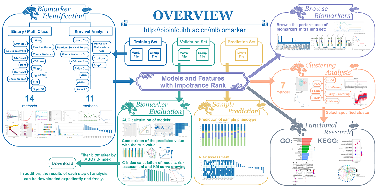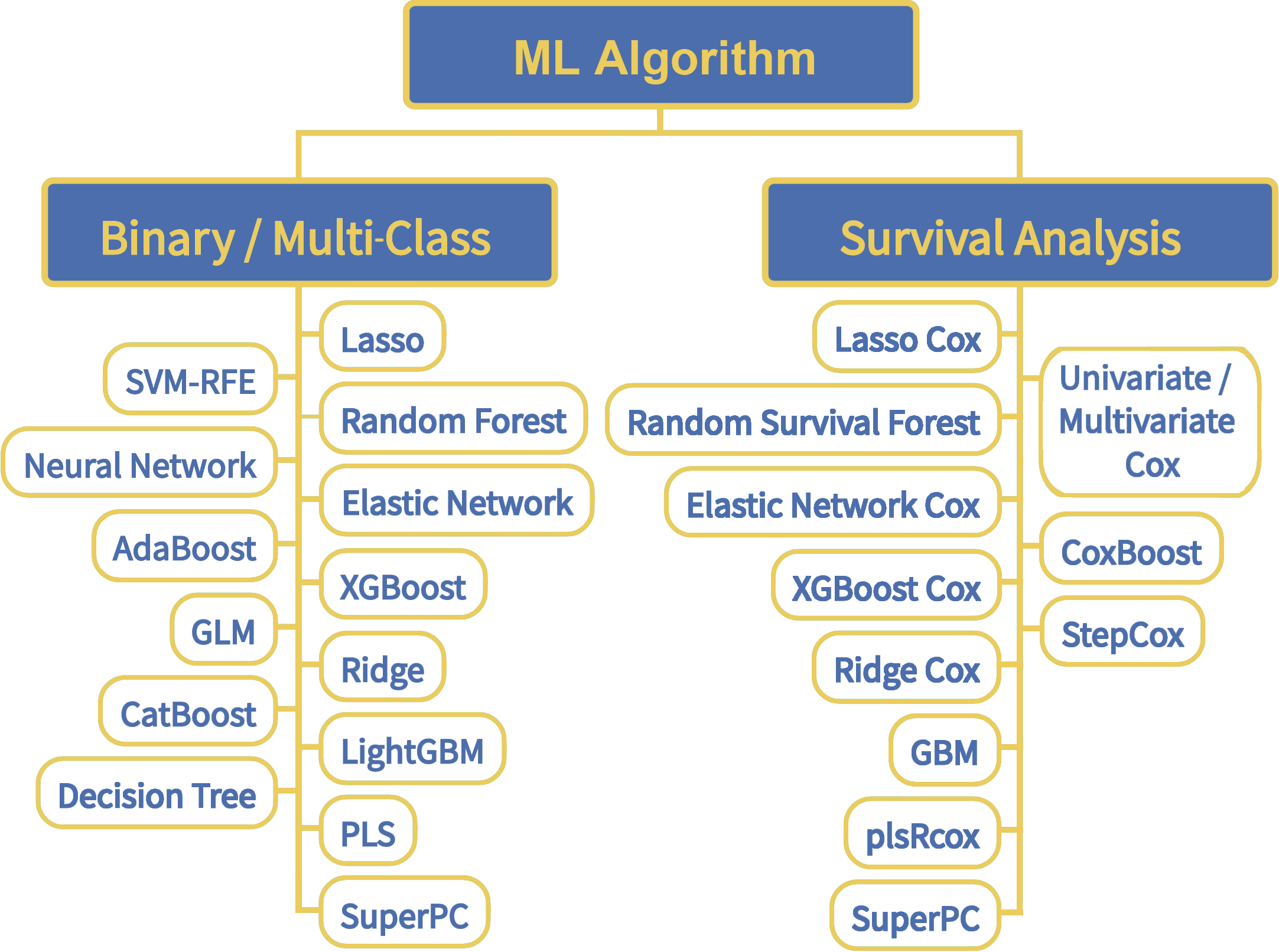 "Biomarker Identification" involves two kinds of analysis: "Binary/Multi-class" and "Survival Analysis". The former is oriented towards biclassification and multi-classification biological events, and MLBiomarker has 14 corresponding analysis methods to choose from. The latter is oriented towards survival analysis, and MLBiomarker has 11 corresponding analysis methods to choose from.